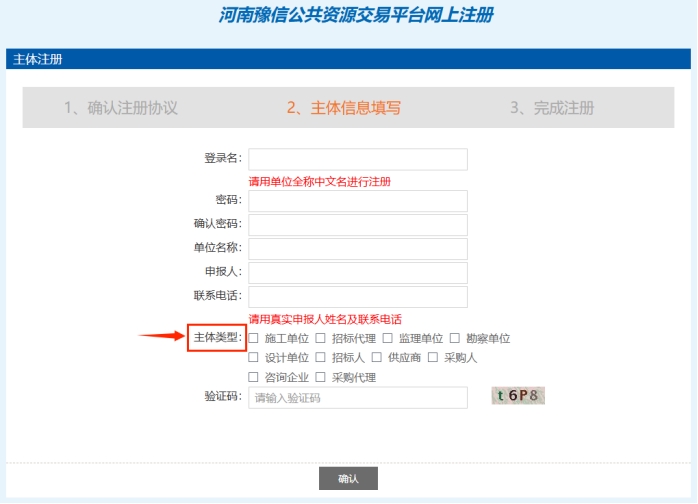 2.3设置登录名、密码、单位名称、申报人及联系电话等信息。根据本单位的类型,选择相应的交易主体类型(可多选;建议“施工、监理、勘察、设计类”投标单位除勾选对应身份外,同时勾选“供应商”身份)。.