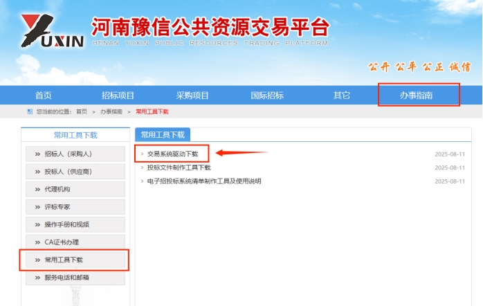 在平台“交易主体登录”界面点击“驱动下载”,或在首页导航栏“办事指南”中“常用工具下载”点击“交易系统驱动下载”。