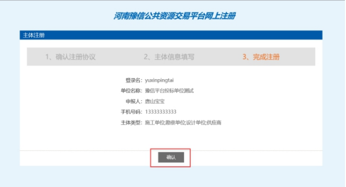 2.4输入验证码点击“确认”,提示“新增主体信息成功”。然后点击“确定”完成单位基础信息注册。