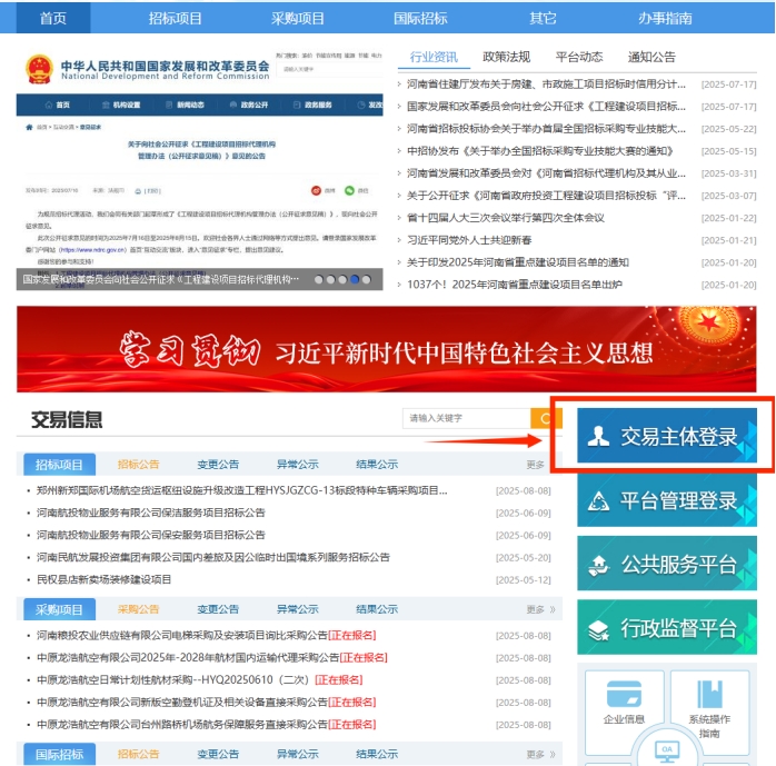 登录河南豫信公共资源交易平台网站( /),点击【交易主体登录】按钮进入交易主体系统登录页面。
