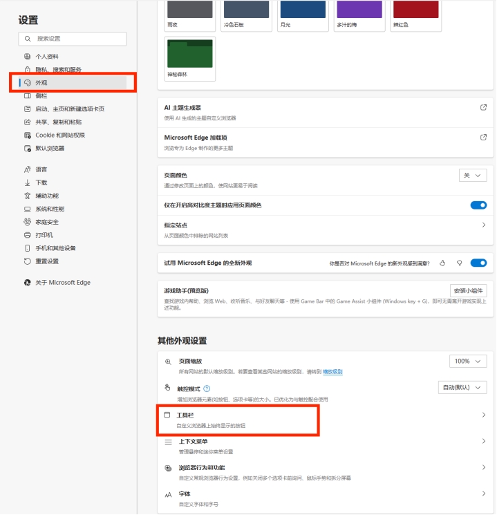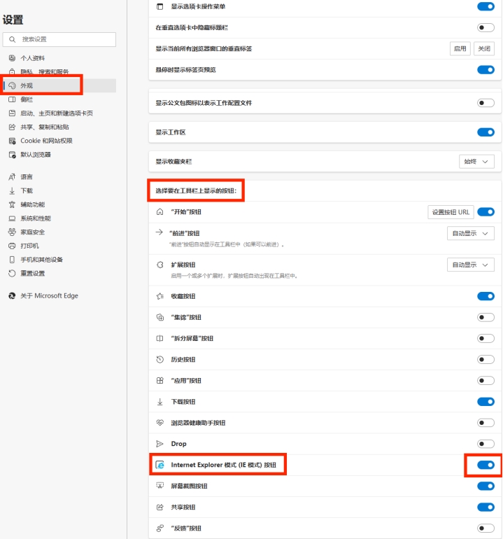 也可以在Edge浏览器地址栏输入“edge://settings/defaultbrowser”并回车,或通过右上角菜单(…)进入“设置”>“外观”>其他外观设置>工具栏,将“Internet Explorer模式按钮”打开。