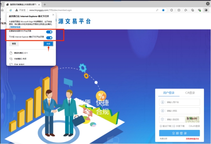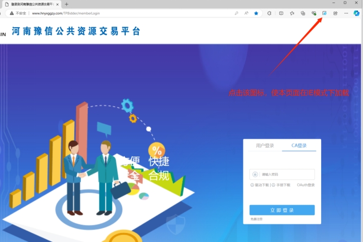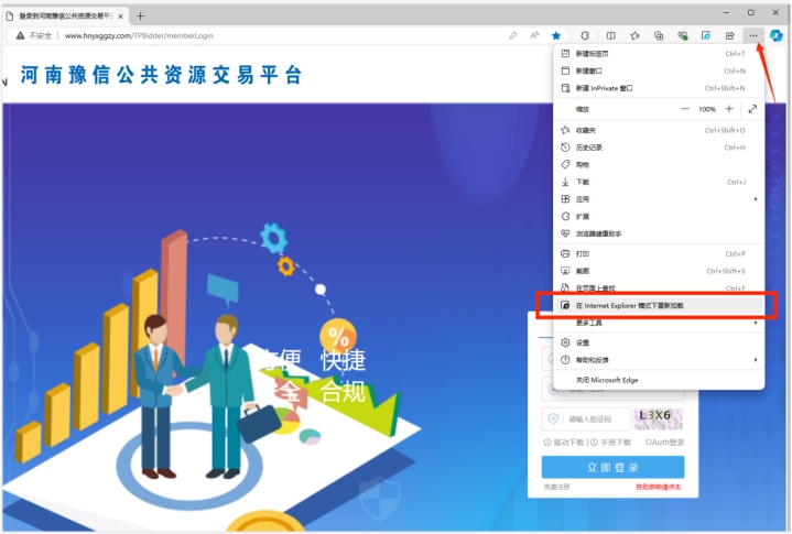 第2步:进入平台登陆界面,在Edge浏览器页面右上角点击“蓝色e”图标,确保“在Internet Explorer模式下重新加载选项卡”功能打开。
