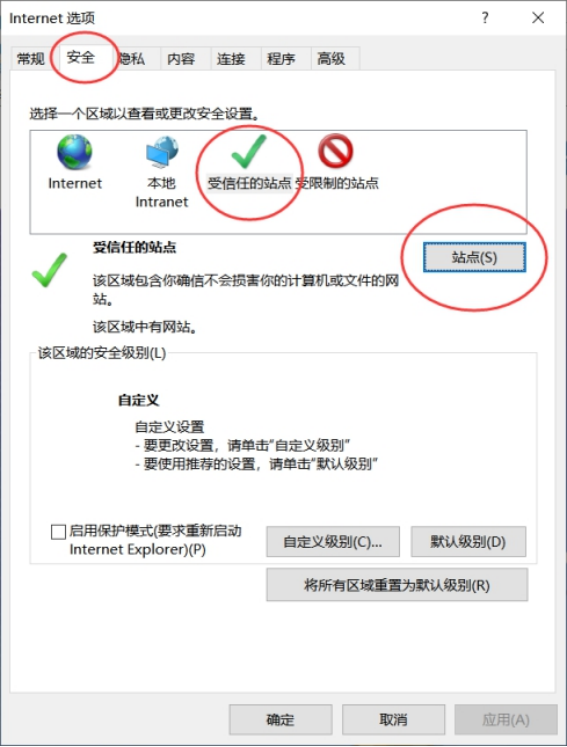 如上图,依次选择标签“安全”——“受信任的站点”(可信站点)——“站点(S)...”,打开如下图所示的界面