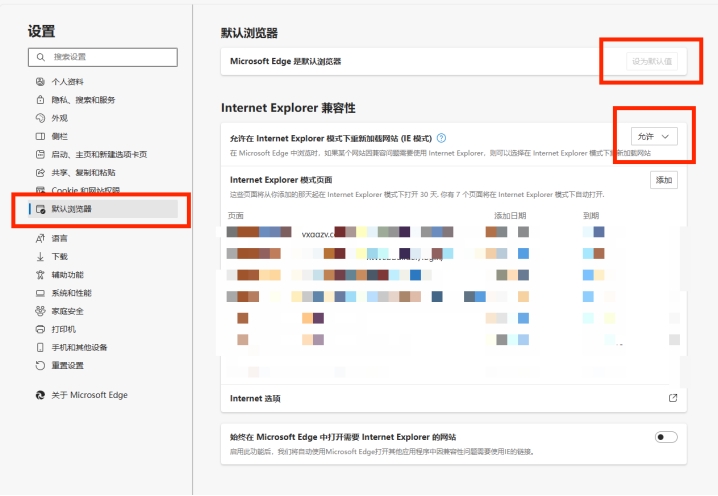 第1步:在Edge浏览器地址栏输入“edge://settings/defaultbrowser”并回车,或通过右上角菜单(…)进入“设置”>“默认浏览器”,将edge浏览器设为默认浏览器并将“允许在Internet Explorer模式下重新加载网站”设置为“允许”
