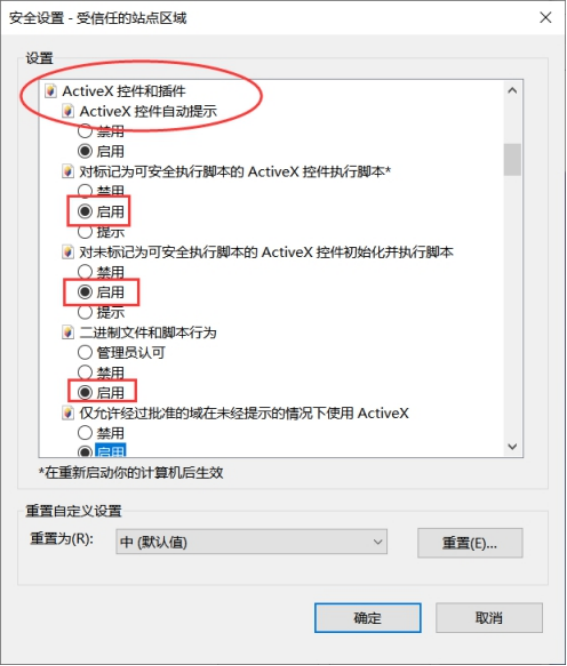 如上图,依次选择“安全”——“受信任的站点”(可信站点)——“自定义级别(C)...” ,打开如下图的界面,把其中的“Activex控件和插件”的设置全部改为启用,最后点【确定】。