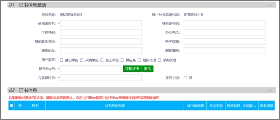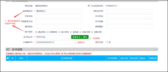 5、 新办理的信安C A 或者其他 地区办理 的信安C A (即从未在 豫信平台 激活过的信安C A) 页面点击 读取证书 等待读取出证书信息后, 填写使用者姓名,勾选用户类型, 点击激活按钮即完成信安C A 的激活操作。 激活成功后,页面会提示成功,且可以在 02证书信息 中看到已绑定激活的证书信息。