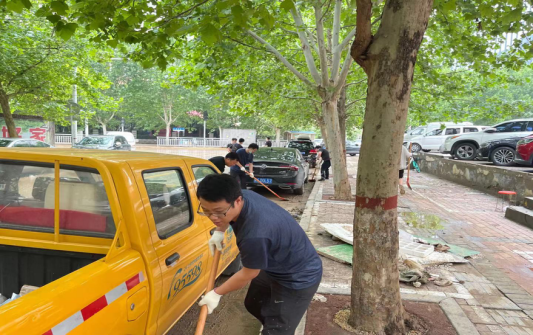 暴雨引发的积水给城区道路上留下了厚厚的淤泥,大家拿着铁锹、穿着胶鞋,沿民航路、英协路一带清理道路两边淤泥及障碍物,帮助社区居民恢复正常生活。志愿者们以实际行动弘扬了“奉献、友爱、互助、进步”的志愿服务精神。