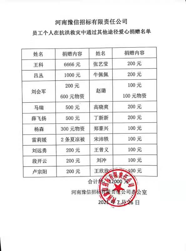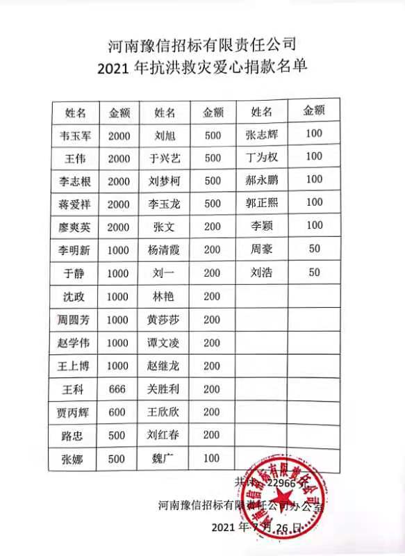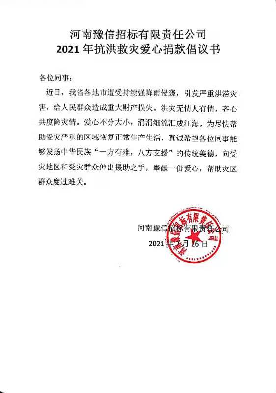 抗洪救灾爱心捐款倡议书发出后 , 我公司员工积极响应,踊跃捐款,共计募集善款 22966 元,全部捐赠于河南省红十字基金会;同时,公司员工通过其他途径自发捐赠的善款与物资合计约 12000 元,也在第一时间送往灾区。