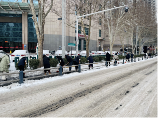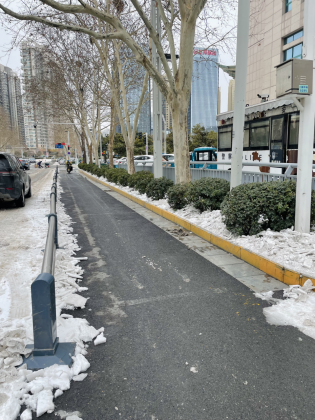 大家用铁锹边敲边铲,一点点“攻克”坚硬厚实的冰层,经过共同努力,非机动车道的冰层积雪彻底清除,最终在冻雪中铲出一条“安心路”,有效保障了附近来往群众的安全通行。