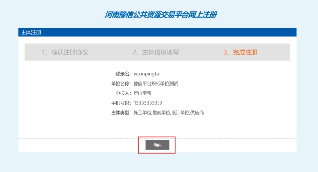 2.4 、输入验证码点击“ 确认 ”,提示“新增 主体 信息成功”。然后点击“确定”完成 单位基础 信息注册。