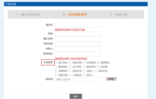 2.3、设置登录名、密码、单位名称 、 申报 人 及联系电话 等信息。根据本单位的类型,选择相应的 交易主体 类型 (进行勾选,可多选) 。