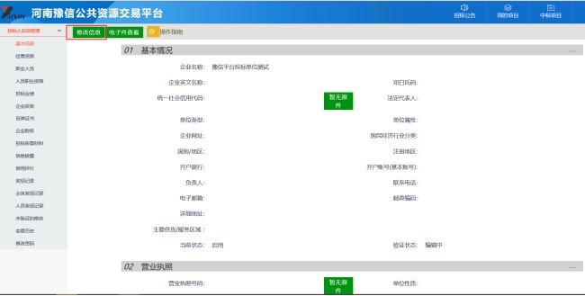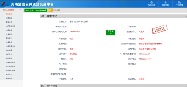 2.8 、 豫信平台管理工作人员会 对 交易主体 填报的基本信息进行 网上验证 ,请关注 交易主体 信息库基本 信息展示页面,查看 验证通 过情况。 (出现待验证状态,请等待交易中心工作人员验证)验证通过后,系统页面会出现“验证通过”标记, 交易主体 即可进行网上业务操作。
